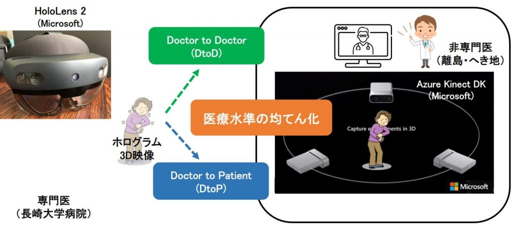NURAS是一個系統(tǒng),通過使用混合現(xiàn)實和其他技術(shù),使偏遠(yuǎn)地區(qū)(如偏遠(yuǎn)島嶼和專家人數(shù)不足的偏遠(yuǎn)地區(qū))的患者能夠接受風(fēng)濕病專家的遠(yuǎn)程醫(yī)療,其準(zhǔn)確度比以往更高。 雖然傳統(tǒng)的視頻電話或網(wǎng)絡(luò)會議系統(tǒng)可用于遠(yuǎn)程醫(yī)療,但由于只能用平面圖像(二維)觀察和推斷病變部位,主要是在關(guān)節(jié)處,因此很難進(jìn)行準(zhǔn)確的關(guān)節(jié)評估,這對類風(fēng)濕性關(guān)節(jié)炎的治療至關(guān)重要。 在這個系統(tǒng)中,微軟的Azure Kinect DK被放置在病人面前作為深度傳感器,專家戴著微軟HoloLens 2,這是一個實現(xiàn)混合現(xiàn)實的設(shè)備,并使用微軟團(tuán)隊,一個協(xié)作工具。 該系統(tǒng)能對僅用平面圖像難以評估的病變部位進(jìn)行三維(3D)和實時觀察和評估。