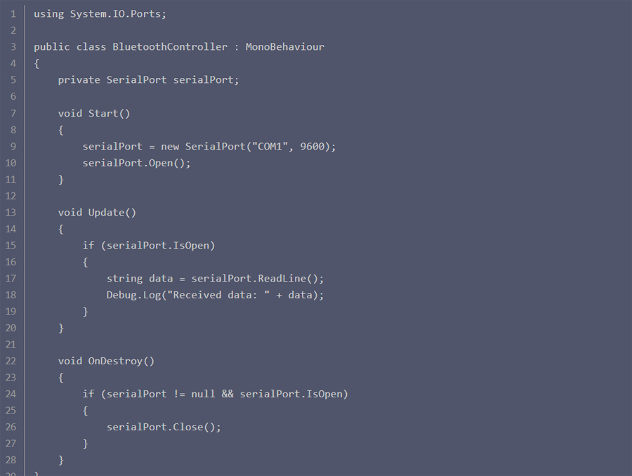 5、在”BluetoothController”腳本中,使用Unity的SerialPort類來打開串口連接藍牙設(shè)備。你可以指定串口號、波特率等參數(shù)。例如: